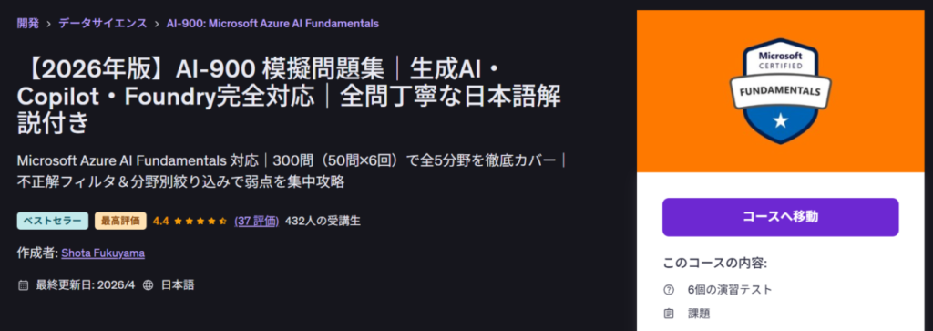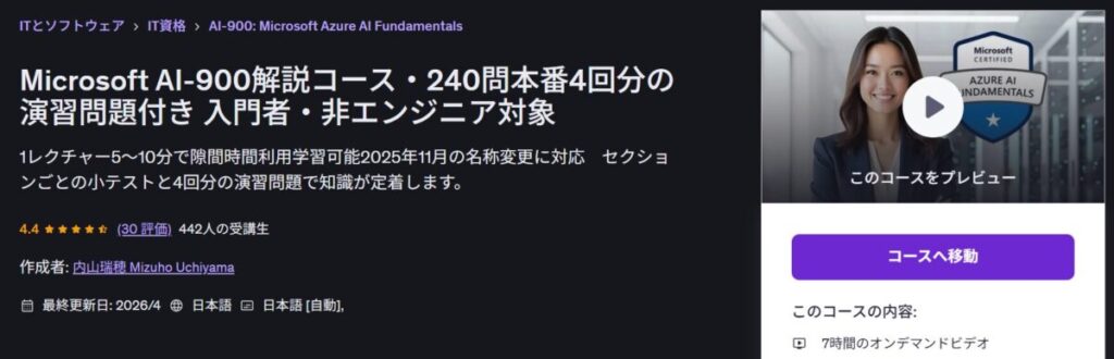 Udemyでは他にも複数のAI-900対策講座がありますが、生成AIワークロードなどの最新範囲に対応しているかを、購入前に必ず確認するようにしましょう。