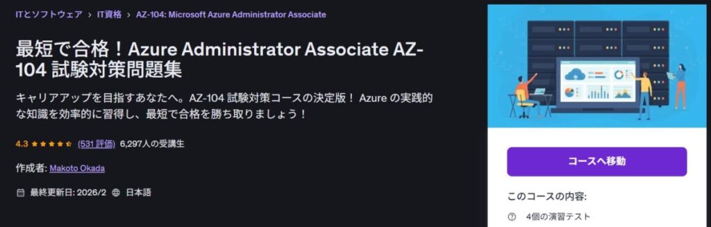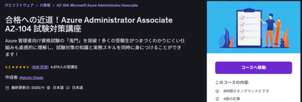 私が実際に比較してわかりやすいと感じたのは、Udemyの「合格への近道!Azure Administrator Associate AZ-104 試験対策講座」です。
