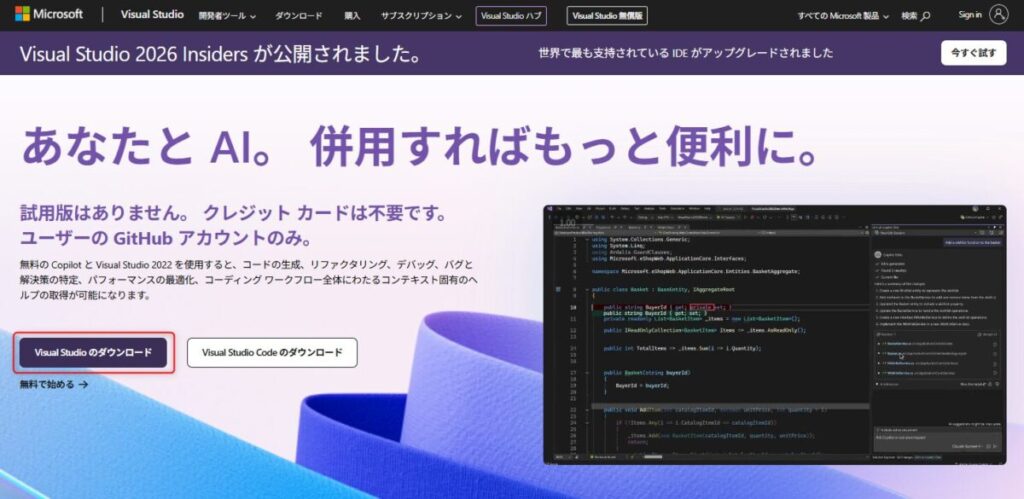 ※Visual Studio Communityという無償版のインストーラーがダウンロードできます。
