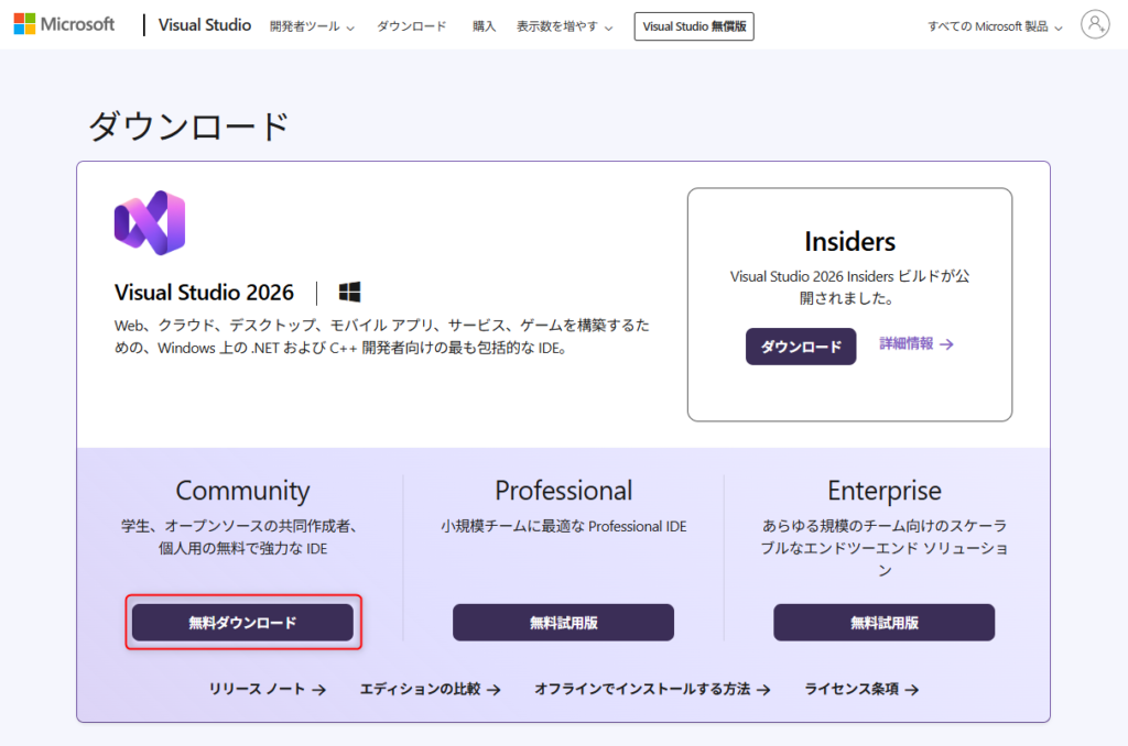 Visual Studio ダウンロードページからCommunityの「無料ダウンロード」をクリックして、インストーラーをダウンロードします。(Visual Studio 2026のインストーラーがダウンロードされます)
